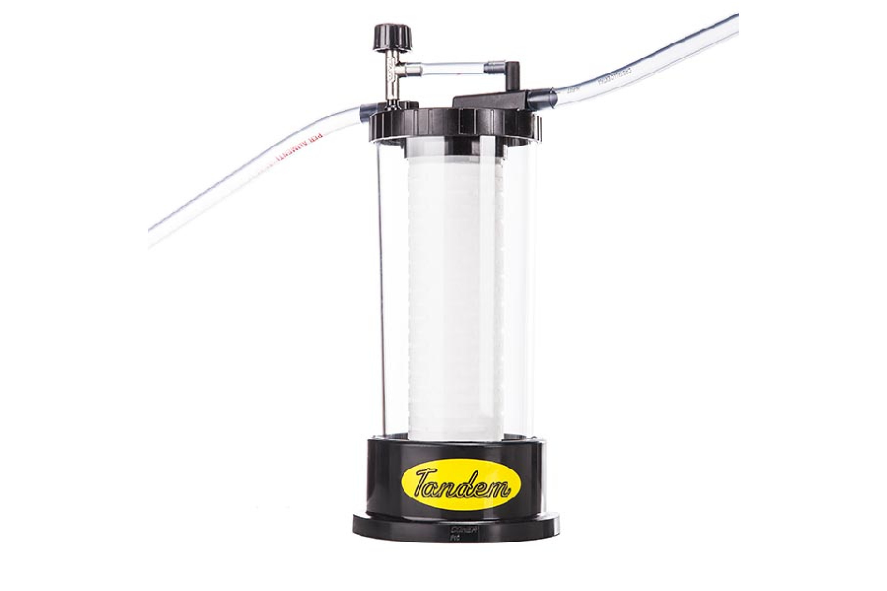 Plastová průhledná válcová nádoba s plnícím víkem, do které se vloží filtrační svíčka.